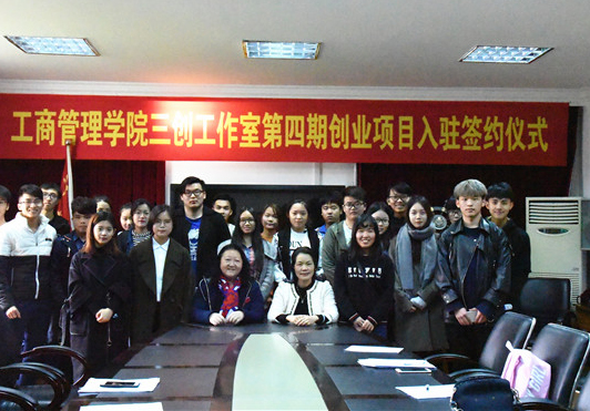3月15日下午,工商管理学院举行第四期三创工作室创业项目入驻签约仪式。学院副院长傅丽、党委副书记林芙蓉、全体辅导员及8支创业团队参加了仪式。